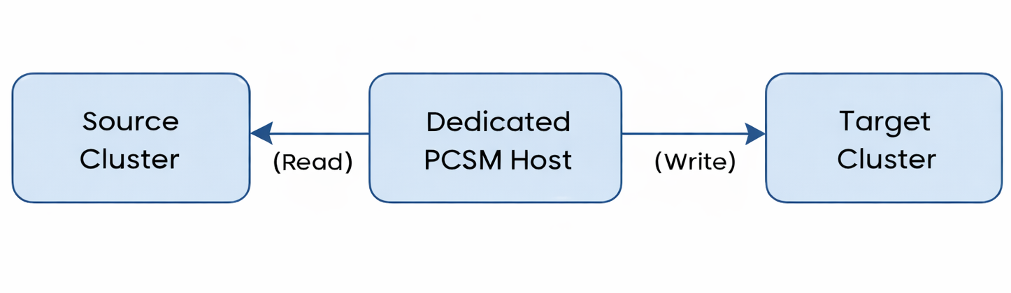| Stability: In the event that PCSM crashes or becomes unresponsive, both the source and target clusters will remain completely unaffected. | Infrastructure cost: Requires provisioning and maintaining an additional compute resource for the PCSM service. |